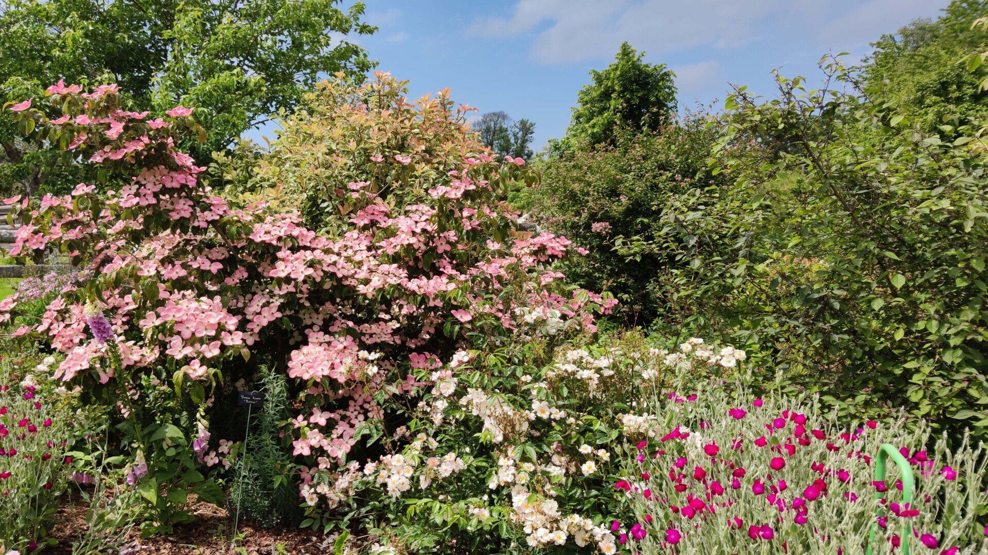 A côté du verger de Malus un massif de 300 m2 d'arbustes et rosiers :