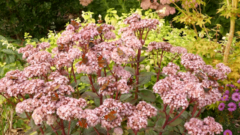 A côté du verger de Malus un massif de 300 m2 d'arbustes et rosiers :