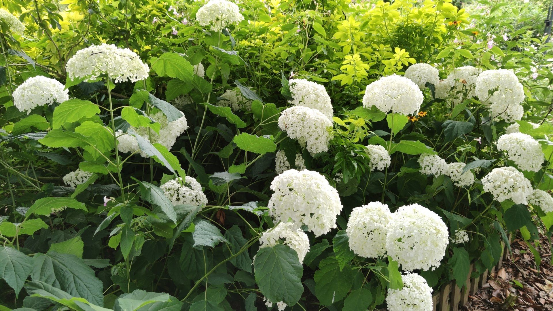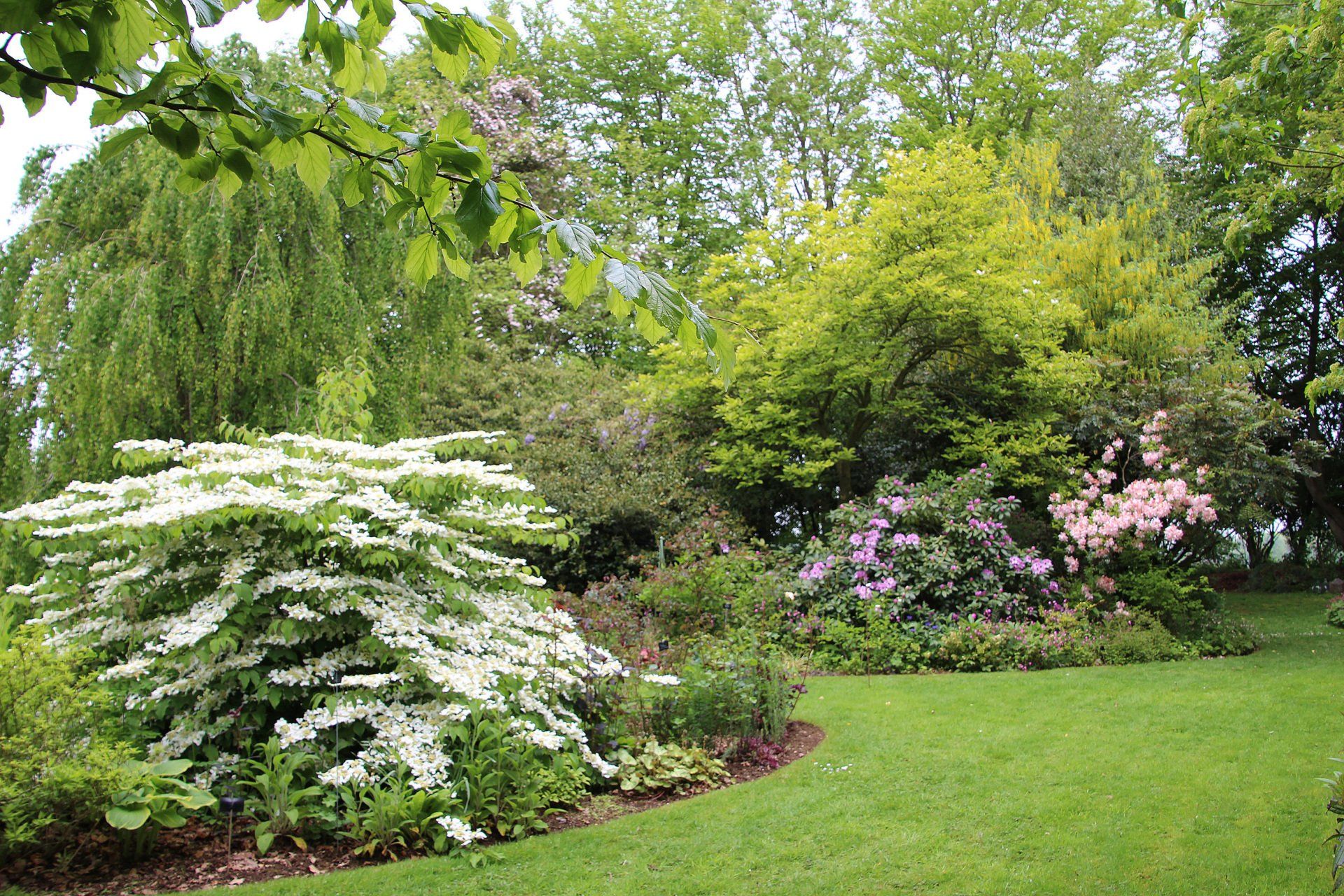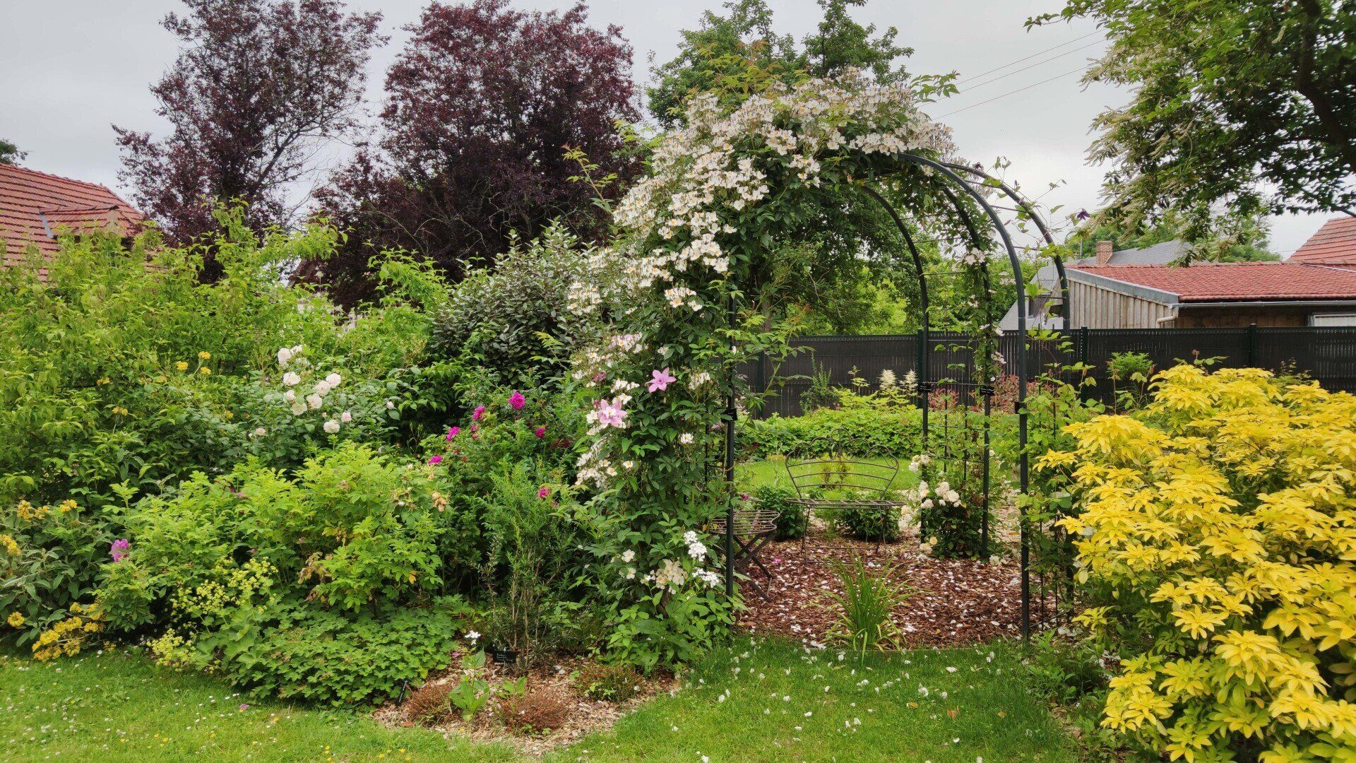 A côté du verger de Malus un massif de 300 m2 d'arbustes et rosiers :